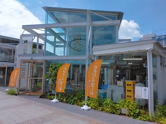| JR尾張一宮駅の東口、目の前にあるガラス張りの建物が、尾州ブルーイング。 毛織物産業が盛んな土地柄にちなみ、ここのビールには 「ウールとエール」というブランド名が付けられています。 (訪問日:2024年8月24日) |