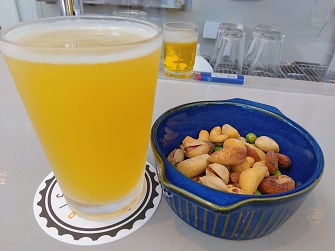 | タップは8つで、自家製ビールはそのうち4種類(⇒ラインナップはこちら)。 この日は、その中の3種類をいただきました。 【写真左】はヘイジーペールエール(1/2pint 1,050円)とオリジナルミックスナッツ(400円)。 |