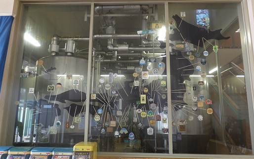| 入口をくぐると、すぐに大きなタンクが眼前に。 ガラス張りに日本地図があしらわれていて、各地の醸造所の場所が示されています。 |