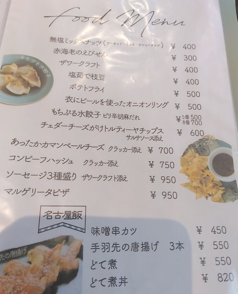 以下は訪問時のフードメニュー。