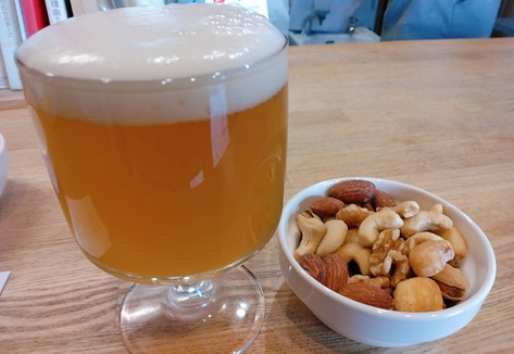 | ビールタップは6つで、うち5種類が自家醸造。 (⇒この日のビールのラインナップはこちら。) 私は、ミックスナッツをあてに、厳選の4種類を堪能しました! |