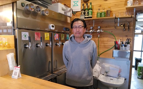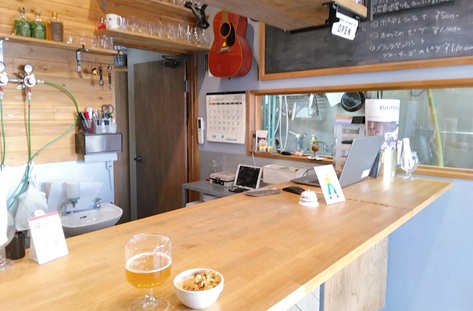 | 小さな立ち飲みカウンターがあるだけのタップルーム。 カウンター横の小窓の先がすぐ醸造所という、臨場感が素敵。 |