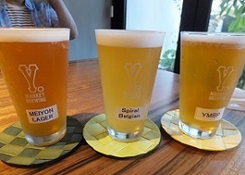 レインコールセッションIPA *度数3.8%と軽いが、トロピカルな香りがいい。(2015.7.25名古屋市「Y.MARKET BREWING KITCHEN」) | イヅツグレープフィールド *信州井筒ワインのナイアガラグレープを使用。軽くて爽やか。(同左) | マーヴェリックアンバー *アンバーエール。(同左) |