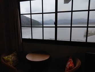 | 泊まらなくても、1階ロビー【写真右上】でここの樽生が飲めます(缶・瓶はない)。 湖上アクティビティをする人たちが泊まる宿ならではの、雰囲気がたたずむ。 |