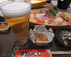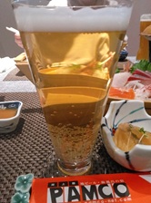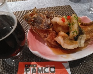 | 2階レストランでの夕食時も、心置きなく自家製ビールを堪能。 お造り盛り合わせやカレイの唐揚げ等、料理が美味でした! |