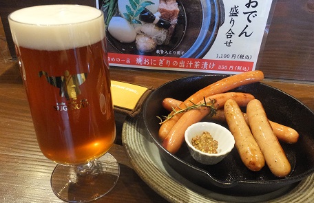 | 写真はソーセージ盛り合わせ(1,200円)とアンバーエール。 ピザもおいしそうでした。 |