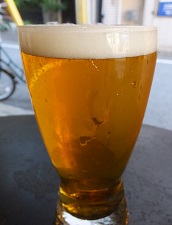 *ケルシュ。淡色透明、香りは白ワインのようだが、軽くてごくごくいける。(2019.6.21京都四条堀川「Bungalow」) |