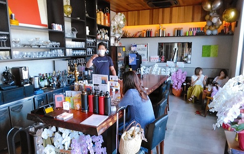 | 開店祝いのお花で一杯の店内は、気さくなバーテンダーが明るい雰囲気を演出。 カウンター5席とテーブル席1つ(4人)で、火曜日の昼の3時なのに先客がちらほら。 |