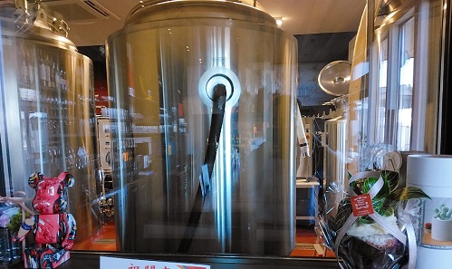 | タップルーム奥から醸造室の様子がうかがえます。 発酵用タンク(600リットル)3つのほか、工程ごとのタンクがあるそうで。 |