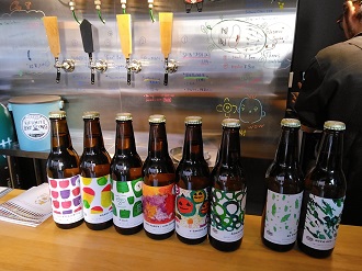 | タップは4つで、ここでしか飲めないという「新屋敷IPA」もタップイン。 瓶ビールの販売も行っていて、この日は8種類。 瓶のラベルには、障害や難病を抱えた方々の作品が使われているそうです。 |