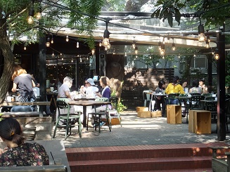 | 鎌倉駅から西へ徒歩5分の場所に、「ガーデンテラス」という 鎌倉ビールの樽生を4種類も扱うカフェレストランがあります(直営ではない)。 テラス席は女性客で盛況。(訪問日:2017年9月3日) |