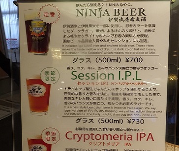 | 樽生は3種類で、グラスは500mlのワンサイズ。 ‘伊賀流忍者麦酒’が定番で、残りの2種は季節限定でした。 |