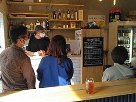 | この日は「目覚麦酒店」で樽生をいただきました。 所狭しの空間には次々と客が来訪。 中には熊本の天草から2時間かけて来たと言う一人女性客も。 |