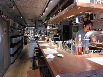 | 「コ」の字型のカウンター席【写真】の奥に、テーブル席もあり。 その奥に、醸造室があります。230リットルタンクが7つ。 |
