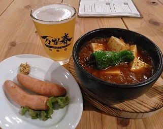 | 「石焼麻婆豆腐」(638円)が熱々で旨かったけど、1人で食べるには量が多かった・・。 左は「ガリシア栗豚のソーセージ」(440円)。醸造室【写真右】も広い。 |