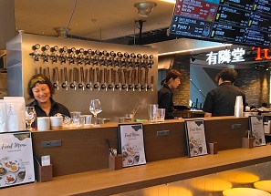 | 奥のパブコーナー(↓)は、カウンターとテーブル席で計25席程。 ビールのタップ数は12で、自家醸造ビールはそのうち7種類 (残りは海外のゲストビール)でした。 |