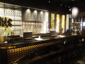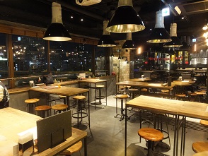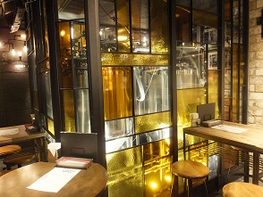 | 「ONE's BREWERY Pub Kitahama」は、北浜1丁目交差点の北東にあるビルマビル北浜の8階。エレベーターを降りると目の前に醸造設備が、ど〜んと待ち構えています。 | 店内のテーブル席。この店は、窓側のテーブル席で、夜景を眺めながら飲むのがお薦め。 |