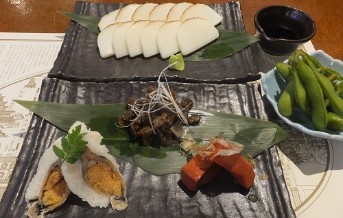 | 手前は湖国三種盛(鮒寿司、しじみの佃煮、赤こんにゃく)(780円)、 奥は長浜産かまぼこ(400円)。どれもビールに良く合いました。 |