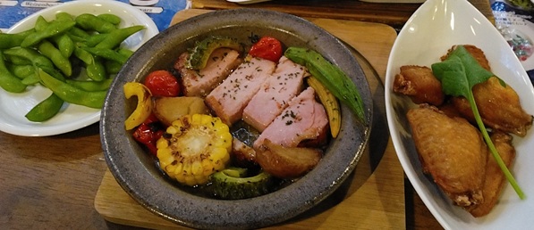 | 「枝豆」、「スモークロースハムと夏野菜の窯焼きグリル」、「カリッとチキン」。 どれもおいしかった。 |