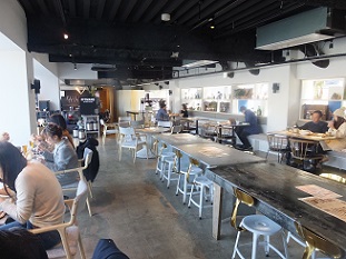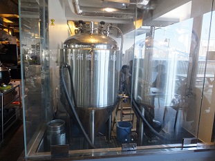 | 「PITMANS」の店内。ランチタイムに訪れたため、ビールを飲まずに普通にランチを楽しむ女性グループもいました。 | ビールは7種類。このうち、この清洲橋醸造所で造っているのは3種類(清澄アンバー・中州ゴールデン・清洲橋ドライ)で、あとの4種類は他社へ醸造を委託しているアウグスビールです。 |