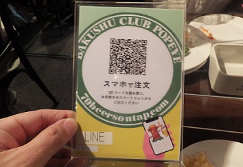 | ビール・料理の注文は、席番号ごとに割り振られたQRコードを読み取り スマホから行うシステム。実に合理的です。 |
