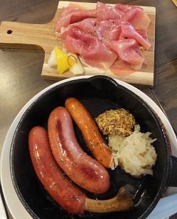 | ビールに合う食事も充実。今回は3人で訪れ、 生ハム・ソーセージ・温玉ポテトサラダを戴きました。 |