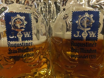 | 意外にすいてるホーフブロイのテラス席に腰を落ち着け、駆けつけ1杯のオクトーバーフェストビール。1杯が全て1リットルで、値段は11.4ユーロ。気温は7〜8度と低かったものの、周りの熱気のせいか暑いぐらいでした。 | 次に、1番人気のアウグスティナーのテントへ移動。1328年修道院でのビール造りに起源を持つ、ミュンヘン最古のビール醸造所。劇混みだと聞いていましたが、テラス席へ行くと若者グループの横が空いていてラッキー。 | |||