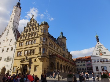 | 城壁に囲まれたローテンブルクは見どころ一杯でした。写真はマルクト広場、左が市庁舎、右の建物は市参事宴会場(市長のワイン一気飲みのからくり時計が有名。)。 | 「ローテンブルクの地ビールあります」と日本語表記が貼られている店があったので、入らない手はない。これがローテンの地ビールか否かは不明ですが、ゴールドオクセン・ブロイシュピールバッハ(400ml、3.5ユーロ)。 | |||