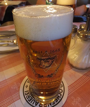 | Schloss Brauhous店内。日本ではしょっちゅう見ているこういう光景も、ドイツで出会うとまた格別です。 | ここではデュンケルヴァイツェンとヘレスを飲みました。こちらの地ビールはくせのない、素直な味が多いようです。 | |||