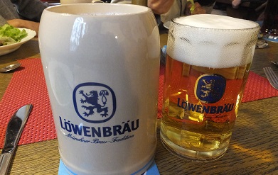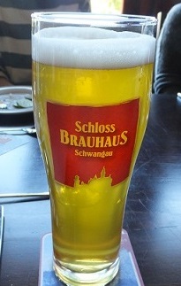 | ノイシュヴァンシュタイン城。旅行中は雲1つない快晴が続き、行く場所、行く場所で感嘆の連続でした。 | 城の近くにあるSchloss Brauhousという醸造所直営レストランで昼食。Brauhousは醸造所という意味だというのは、帰国してから知りました。 | |||