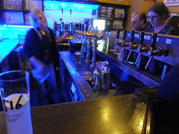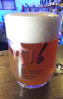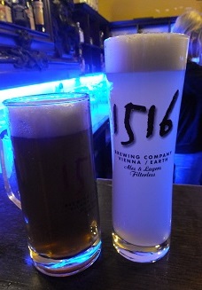 | 青いライトであやしげな雰囲気でしたが、店内はウィーン子たちで盛況。ちなみにブルワリー名の「1516」は、「ビールは麦芽・ホップ・水・酵母のみを原料とする」というビール純粋令が制定された年にちなんでいるそうです。 | 左から「1516 Black&Tan」(ダーク&ブロンドエール)、「1516 Welase」(ウィートエール系)、「Victory Hop Devil IPA」。薄暗い店なので変な色に写っていますが、どれもうまかったです。 | |||