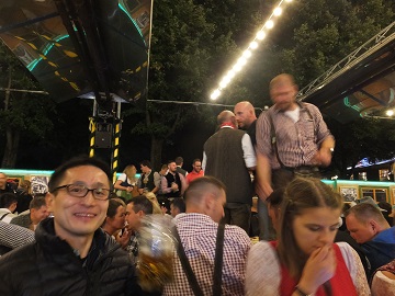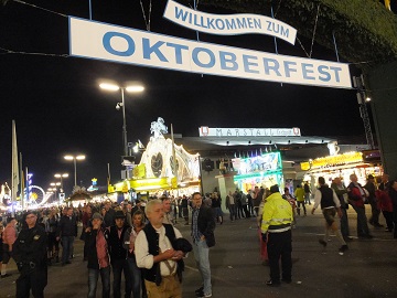 | 会場入口。まるでテーマパークのようですが、すれ違う人々は皆酔っぱらっている。1週目はドイツ人ばかりで、2週目以降になるとイタリア人たちもどっと押し寄せるそうです。 | テントの中の様子。現地の人たちの熱気がものすごい。とにかく、まずは席に座らないとビールを注文できないシステムなので、席探しに奔走。 | |||