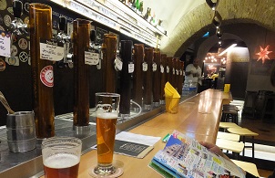 | トラストヴェレというローマの繁華街の一角に、その店はありました。 店はカウンターが15席ほどで、奥にはテーブル席もあるようです。 タップ数はなんと20! |