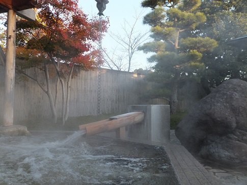 | 歩き回り、疲れた体を休めるべく、ビール前に天然温泉「里の湯」へ。入湯料1500円もかかるだけあって、露天の広さには感動。 |
