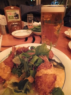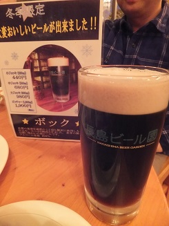 | デュンケルはコクの深さにナッツのような甘さが見事にマッチ、この4種類の中では一番良かった。 ボックは「冬季限定」。麦芽1.5倍使用の黒ビールだ。 そしてフードは、ソーセージ盛合せと枝豆、エビとチーズのコラボフライ。 |
