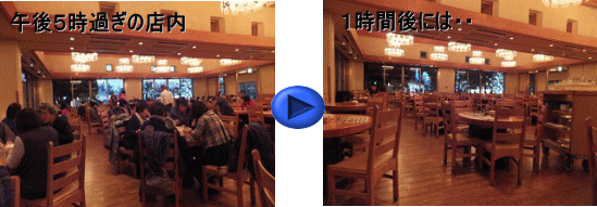 | 入店した夕方5時過ぎには、300人収容の第2会場がほぼ一杯になるほどの混雑ぶりだったが、6時を過ぎる頃にはほとんどの客が食事を終え、去っていく。 |