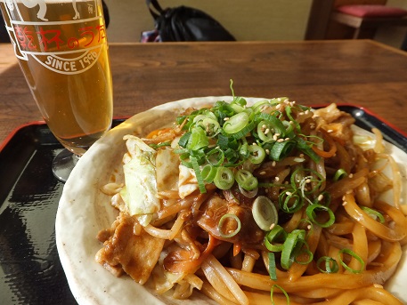 | そのあと、道路の向かい側へ渡って、うどん屋「彦兵衛 太岡寺店」でランチ&ビール。 こちらも地ビールはケルシュ1種類のみ。グラスに「かめやま地ビール」の図柄がプリントされてるのは、私のように写真をアップする者には有難い。 |