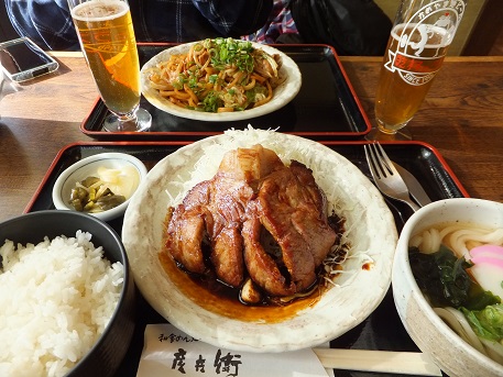 | そして、亀山名物「味噌焼きうどん」と、四日市名物「トンテキ定食」を2人でシェアしていただく。 |
