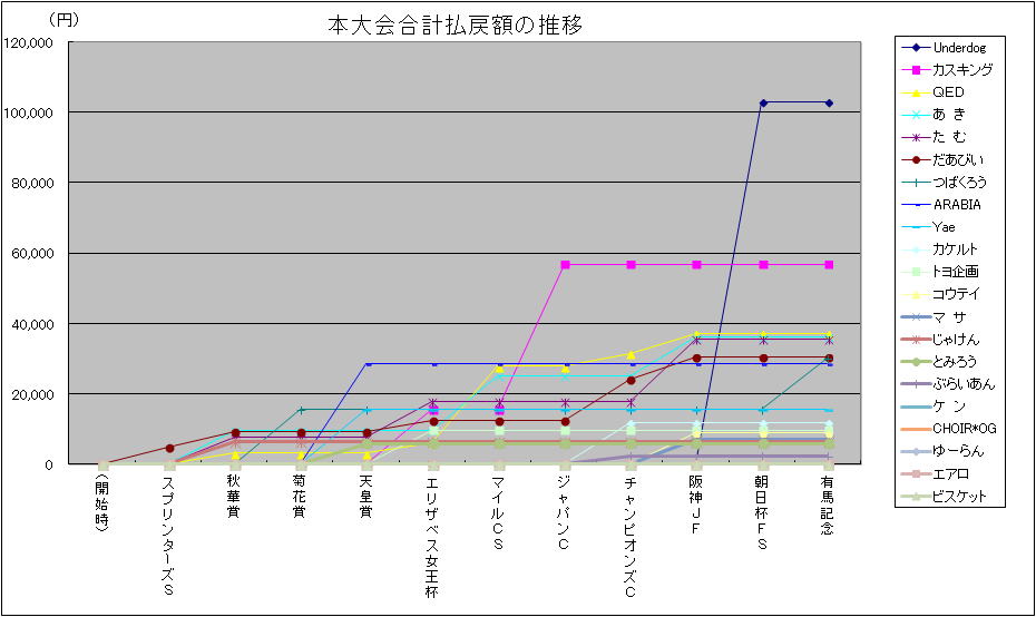| 順位 | 登録名 | スプリンターズS | 秋華賞 | 菊花賞 | 天皇賞 | エリザベス女王杯 | マイルCS | ジャパンC | チャンピオンズC | 阪神JF | 朝日杯FS | 有馬記念 | 払戻額 合計 |