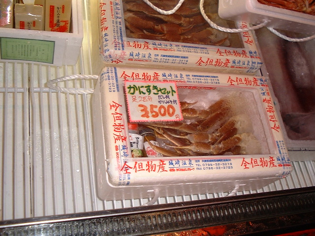 真ん中が川で、土手には雪が積もっています。土産物屋に並ぶかにすきセット。
