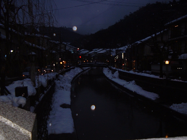 しかし、日本海が近い城崎に到着すると、降っているのが雨に変わった。それでも、前の週に1メートル積もったという雪はまだ残っている。「さあ、写真を撮ろう」と思ったが、もうすでに日没の後。