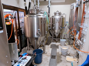 | 醸造室の中。5つの発酵タンクや、缶詰め機など。 ドライホッピングの作業も見学させていただきました(この日はシトラホップ)。 |