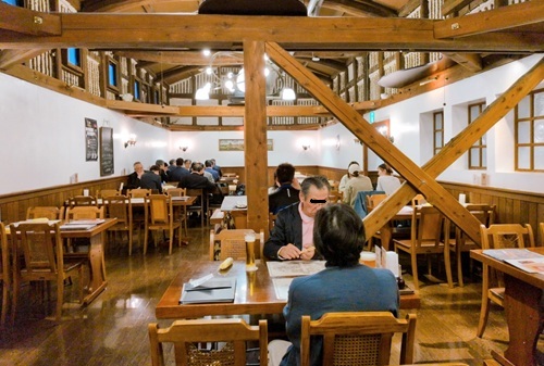 | (↓)ウッディーな造りのメインホール。 築100年を超える米蔵を改装したそうで、 座席間隔がゆったりなので安心して飲むことができます。 |
